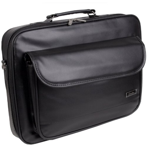 Stylish and professional, the classic black look gives your laptop and accessories a businesslike appearance while this high quality soft case keeps them safe. The fully open padded computer compartment has a Velcro securing strap and detachable divider to surround and protect your precious notebook. Extra interior padding helps absorb shocks and vibration. 2 mesh pockets on upper panel safely hold your accessories, 1 large panel pouch for documents, 3 built in pen or pencil holders, and a small slot for an ID or business cards. The front of this sleek shoulder bag has an attached organizer with a fold over cover. Back panel has a zippered document pocket capable of holding folders or magazines. Dual self-repairing coil zippers make opening and closing easy. Carrying this mesenger bag with you is simple with your choice of methods; the built in heavy duty handle, the included adjustable and detachable ergonomic padded shoulder strap. A reinforced trolley strap on the back pocket makes it easy to securely slip this briefcase on to your other carry on luggage. Fits most computer laptops with up to a 17 inch screen.